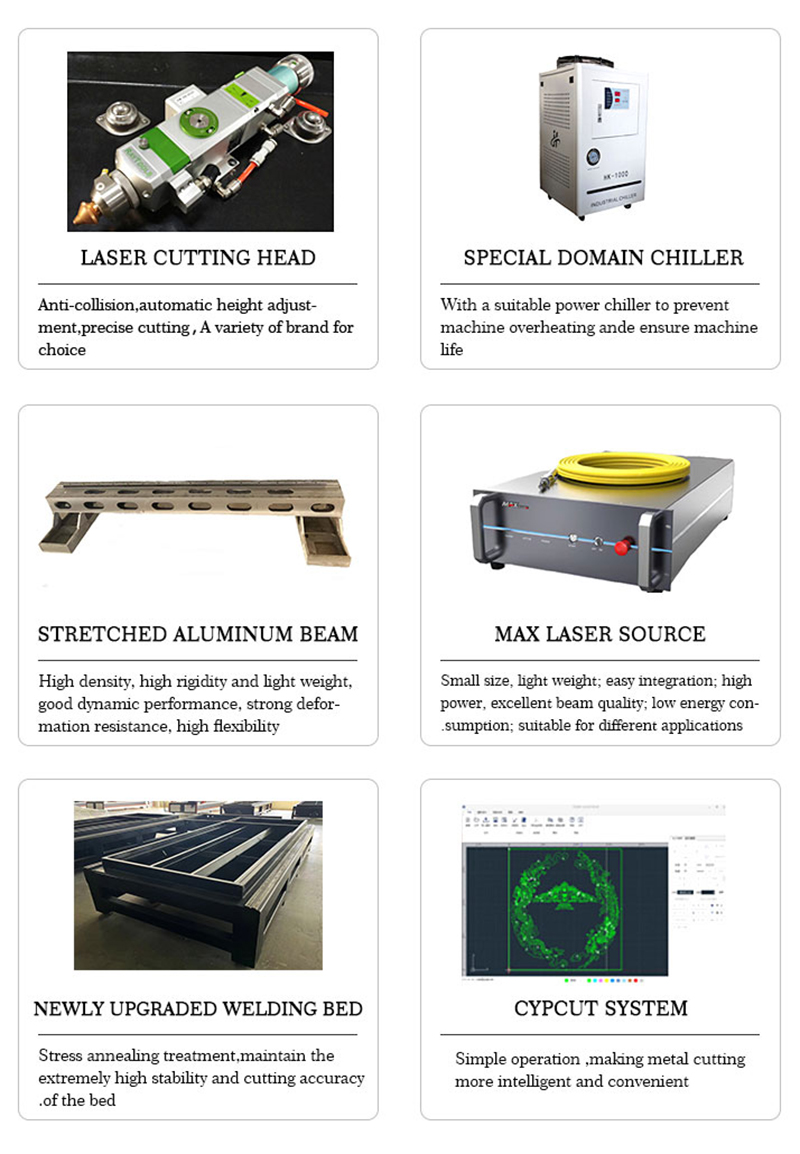 La machine de découpe laser à fibre 3015 adopte des servomoteurs, des réducteurs, des rails de guidage, etc. d'origine importés. La tête de coupe importée d'origine est utilisée, combinée à des accessoires à grande vitesse et de haute précision, pour garantir la qualité de coupe. Le meulage d'engrenages de haute précision, les rails de guidage importés, les têtes de coupe importées, etc., ont subi des processus d'assemblage stricts pour garantir la vitesse et la précision de la machine. Le laser peut être sélectionné en fonction des besoins du client.