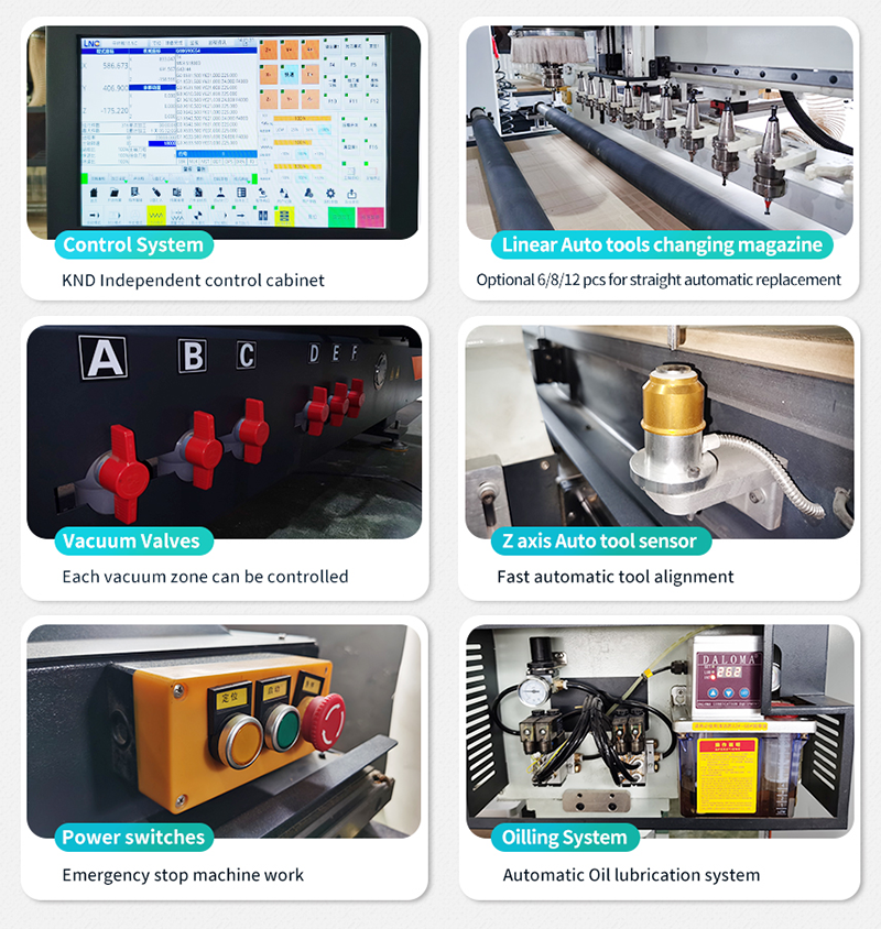 Le routeur CNC en bois atc à prix d'usine adopte le système de contrôle Taiwan LNC, 12 outils rapides à changement. Il a une coupe lisse de haute précision. Principalement utilisé dans le traitement des meubles en panneaux.
