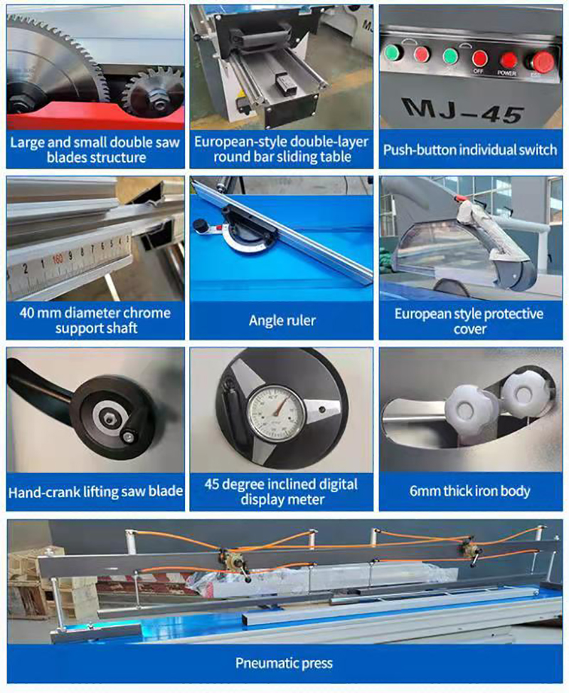 1. Scie à panneau élévateur à 45 degrés ou 90 degrés, facile à utiliser4. La surface de la table adopte un traitement d'oxydation, un beau meulage.